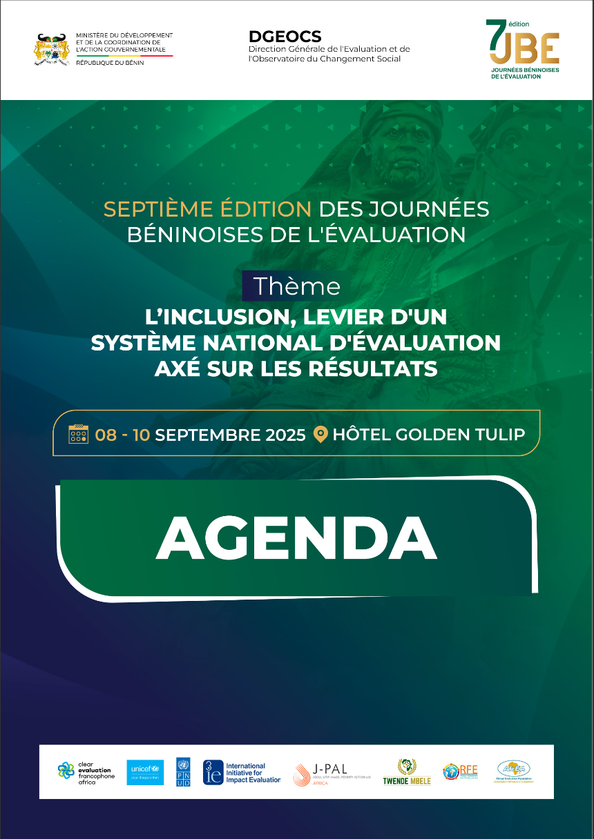 Sous la haute autorité du Ministre d’État Abdoulaye BIO TCHANÉ, le ministère du Développement et de la Coordination de l’action gouvernementale, organise à travers la Direction Générale de l’Évaluation et de l’Observatoire du Changement Social (DGEOCS), du 08 au 10 septembre 2025 à l’Hôtel Golden Tulip de Cotonou, la 7ᵉ édition des Journées Béninoises de l’Évaluation (JBE) autour du thème : « L’inclusion, levier d’un Système National d’Évaluation axé sur les résultats ».