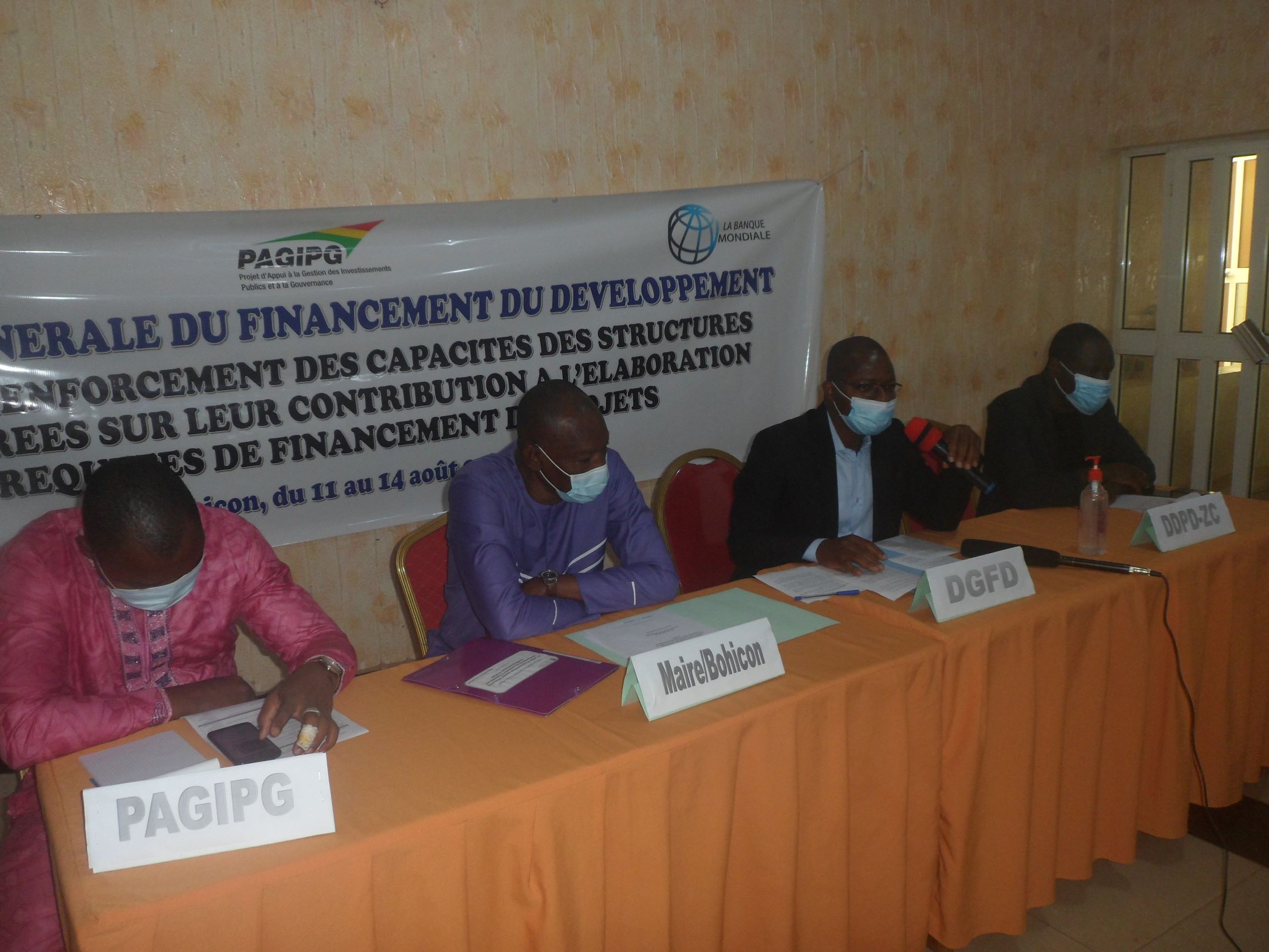 Du mardi 11 au vendredi 14 aout 2020 se tient à l'hôtel la Majesté de Bohicon la deuxième Session de l'Atelier de renforcement des capacités des structures déconcentrées sur leur contribution à l'élaboration des requêtes de financement de projets. Organisé par la Direction Générale du Financement du Développement du Ministère du Plan et du Développement avec l'appui financier du Projet d'Appui à la Gestion des Investissements Publics et à la Gouvernance (PAGIPG), cet Atelier a connu la participation des Directions Départementales des Ministères en charge des Infrastructures et des Transports, de l'Eau et des Mines, de l'Agriculture de l'Elevage et de la Pêche, des Enseignements secondaire et technique, du Cadre de Vie et du Développement Durable, de la Santé, du Plan et du Développement, ainsi que des préfectures des départements de l’Ouémé, du Plateau, du Zou et des Collines. La cérémonie d’ouverture a été marquée par le mot de bienvenue du Premier adjoint au Maire de la Commune de Bohicon et l’allocution d’ouverture du Directeur Général du Financement du Développement.