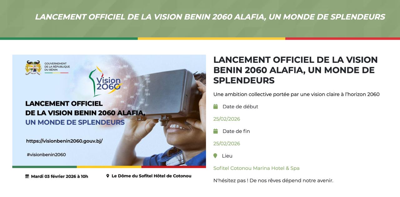 Notre avenir n’est pas une ligne lointaine. Il prend racine ici, dans nos mains, dans notre volonté. Chaque jour, nous cultivons cette heritage. Nous transformons le savoir en progrès, le travail en opportunité et l’innovation en harmonie pour bâtir des villes modernes plus sûrs. Bénin de 2060, un monde de splendeurs, paix, bien-être commun et rayonnement. Lancement Officiel, Vision Bénin 2060 Alafia: un monde de splendeurs. Sous le haut patronage du Président de la République, mardi 3 février 2060, à 10 heures – Dôme du Sofitel Hôtel Cotonou, En direct sur la SRTB et les réseaux du Gouvernement.